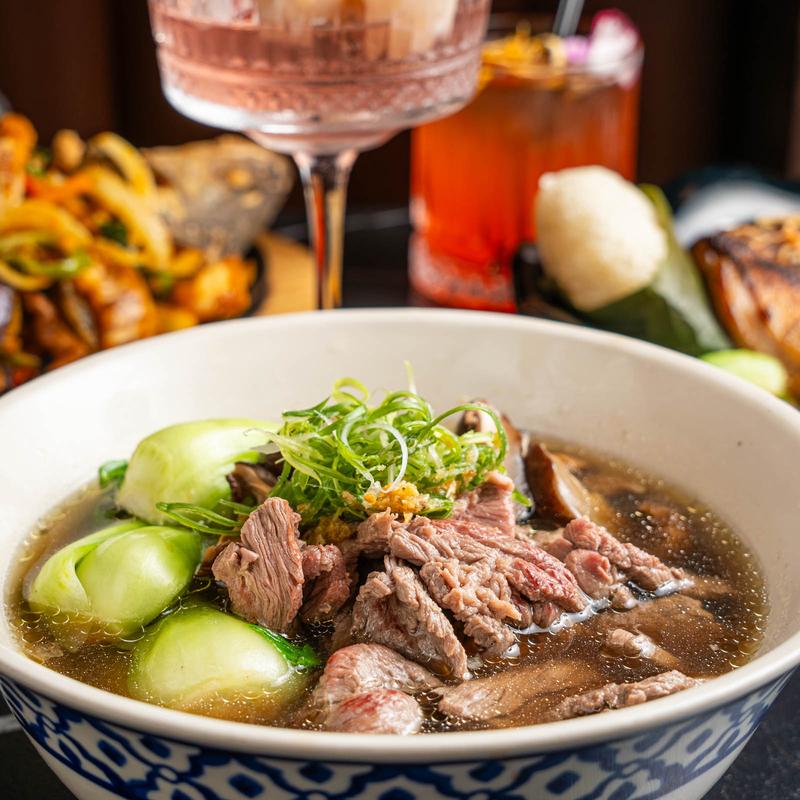Originating in Bangkok’s floating markets. Rich and aromatic pork broth, braised pork and sliced pork, bok choy, basil, scallion and cilantro. Topped with garlic oil.